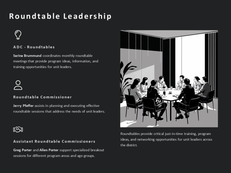 The Northern District Roundtable meeting takes place on the first Wednesday of the month at Harvest Intermediate School at 7:00 PM; 6781 North Towne Road DeForest, WI 53532. Attending a district roundtable meeting can offer several benefits for both new and experienced scouting leaders such as training opportunities, networking, program ideas, district updates, and fellowship with other leaders.. This meeting is typically broken into a Scouts BSA and Cub Scouting session and is led by the District Roundtable Commissioner.